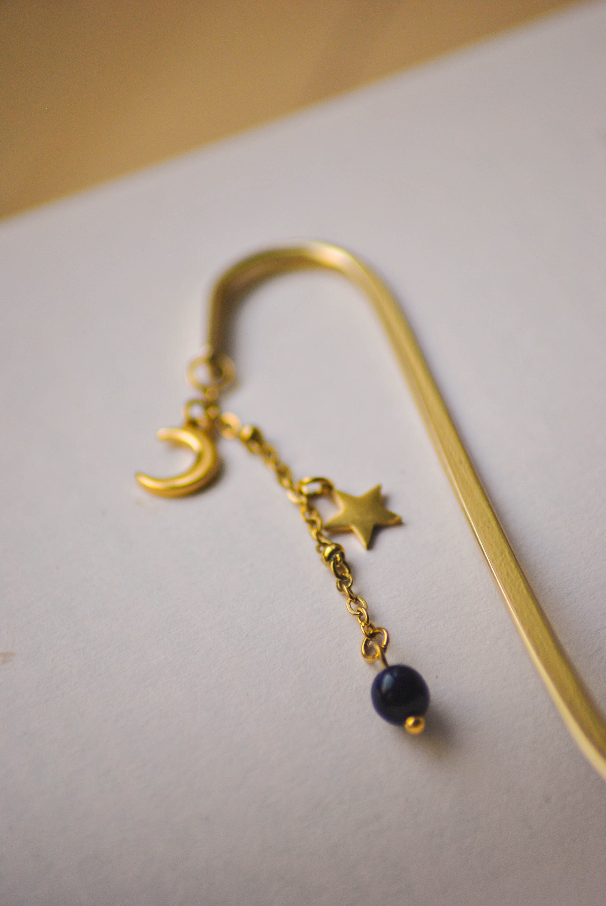 Un marque-page raffiné inspiré par la beauté du ciel de nuit. La lune et l’étoile dorées se marient à une perle bleu marine pour un contraste élégant et intemporel.