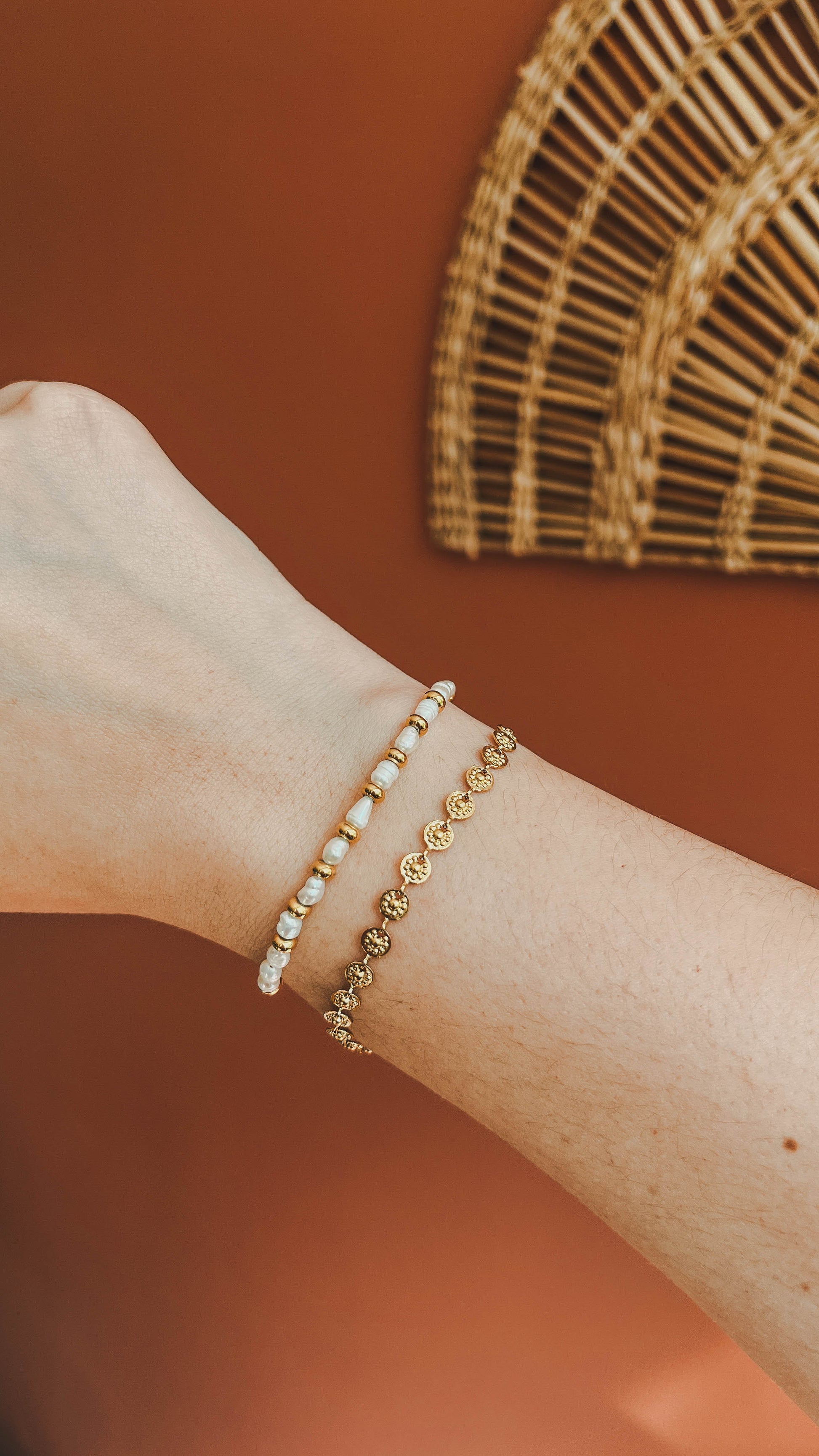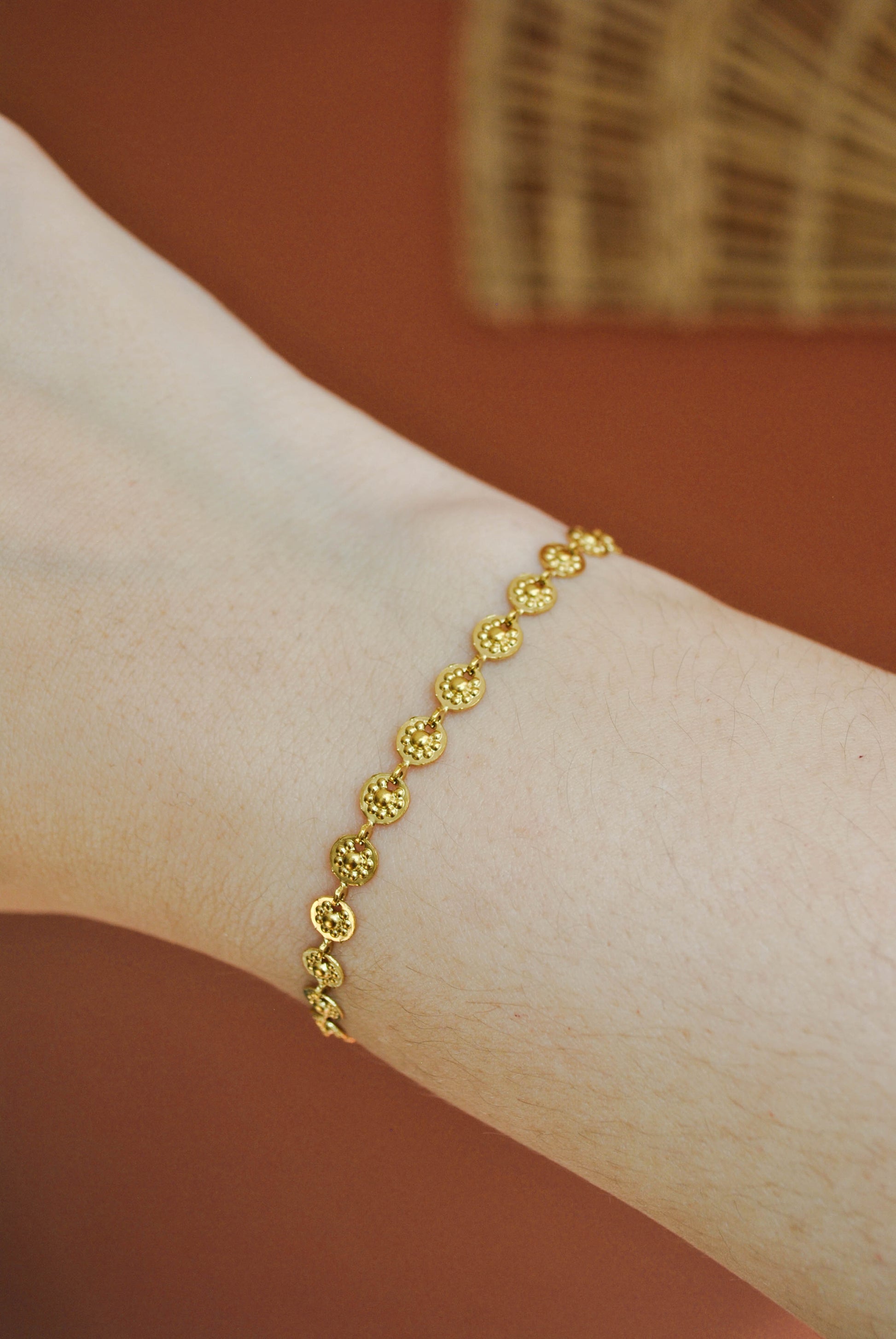 Bracelet délicat en chaîne maille jaseron rond, orné d’un petit motif soleil doré. Un bijou fin et lumineux, parfait pour ajouter une touche solaire et élégante à votre poignet, au quotidien comme en soirée. Idéal pour vos plus belles compositions ! Se décline en collier. Autre bracelets sur la photo : Oria & Marea