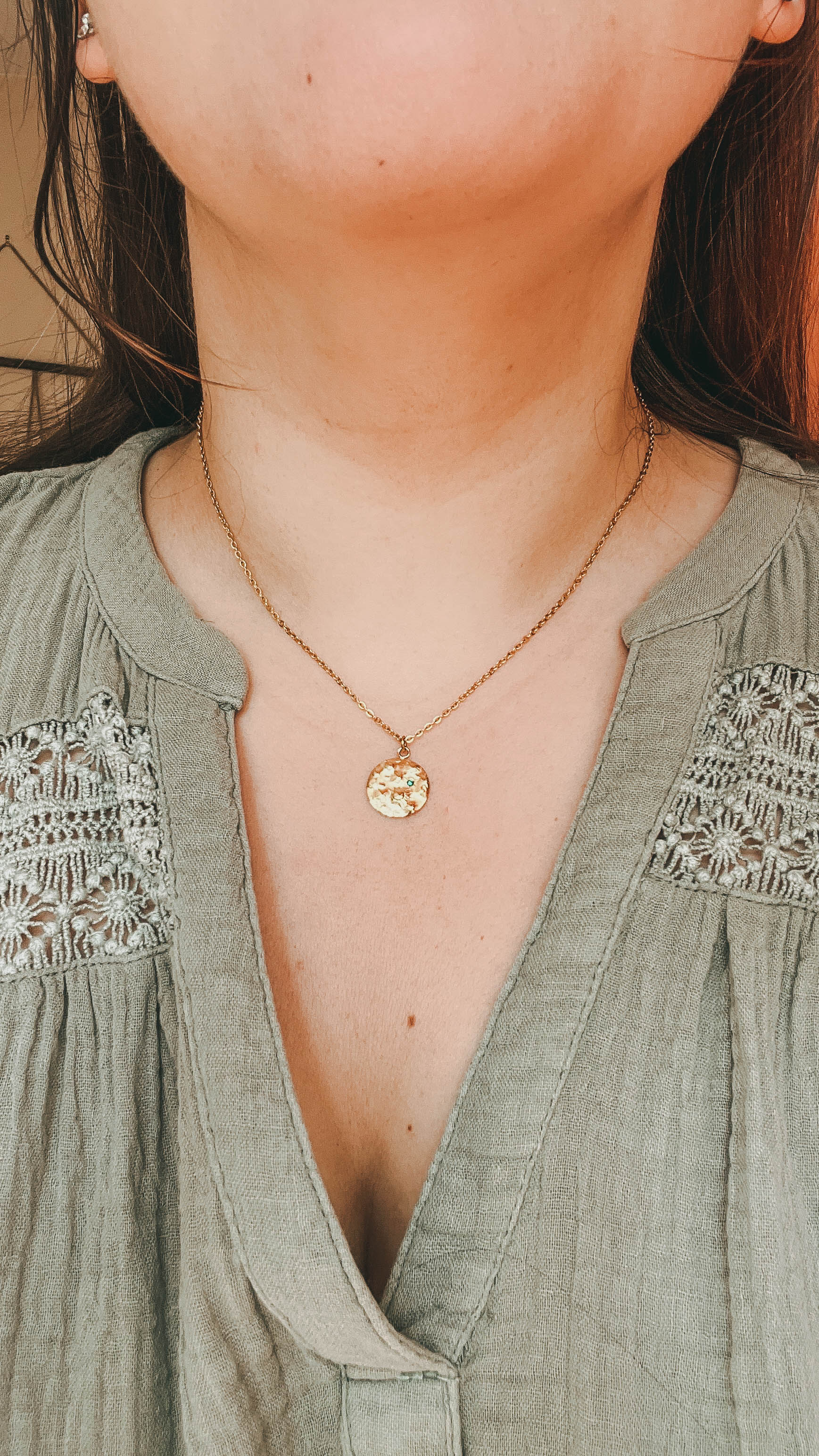 Solia est un collier aux allures naturelles et raffinées. Sa breloque martelée, ornée de motifs soleil, capte la lumière avec douceur. La petite perle turquoise vient illuminer l’ensemble d’une touche colorée subtile.
